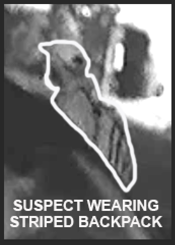 Security video shows two suspects. One suspect was wearing a striped backpack and mask as he was recorded getting into a vehicle. As he walked back out to the street, he was met up by his partner in crime.